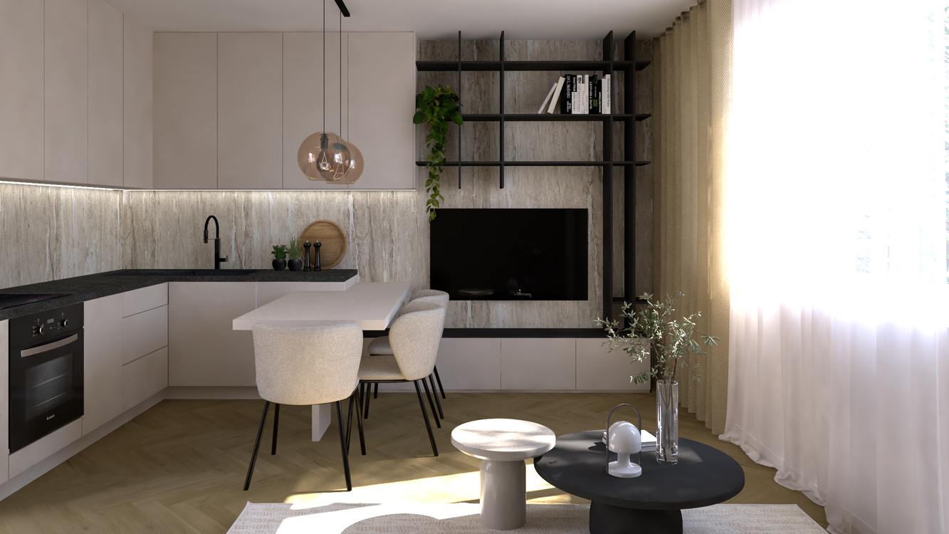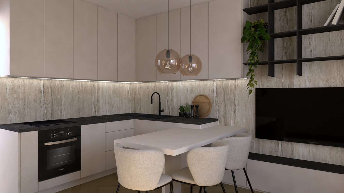 - kuchynského kútu (kuchynská linka na mieru a vstavané spotrebiče, stôl a stoličky)