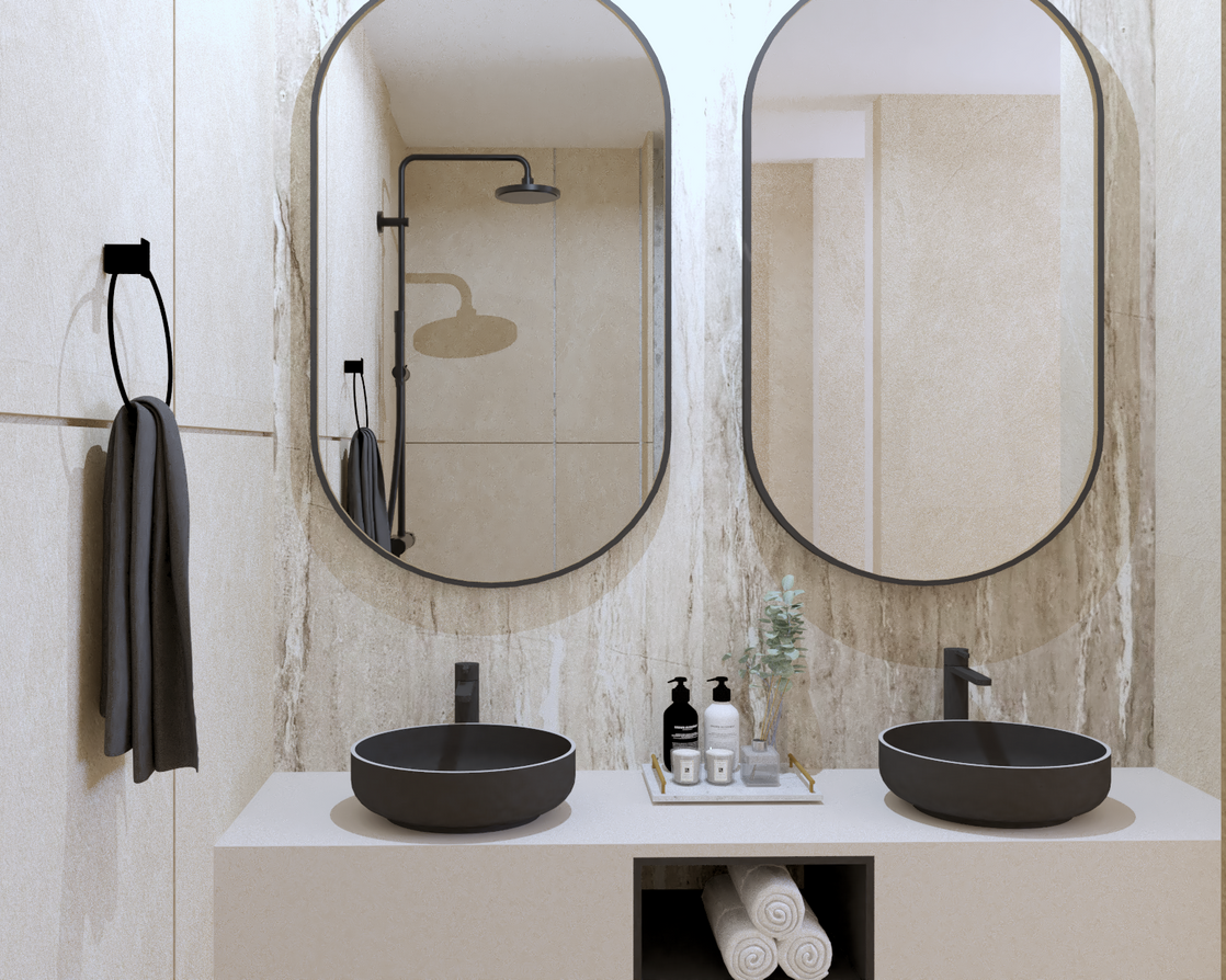 - nadčasová kúpeľňa s modernými obkladmi