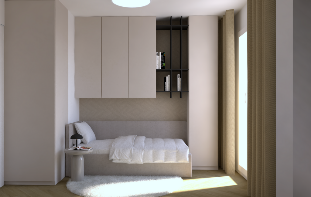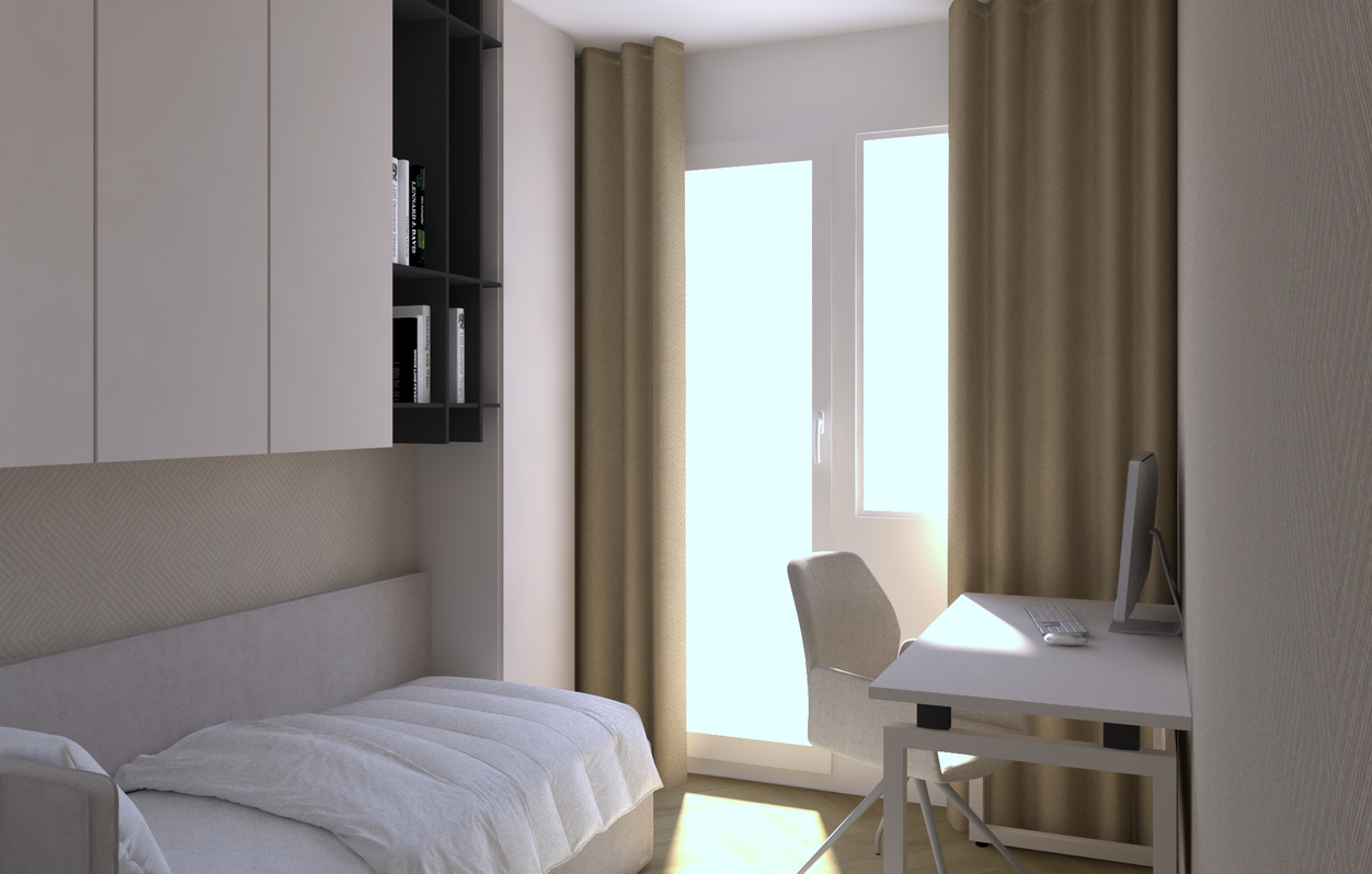 - zariadenie izby - buď ako detská izba (viď vizualizácia), prípadne ako pracovňa
